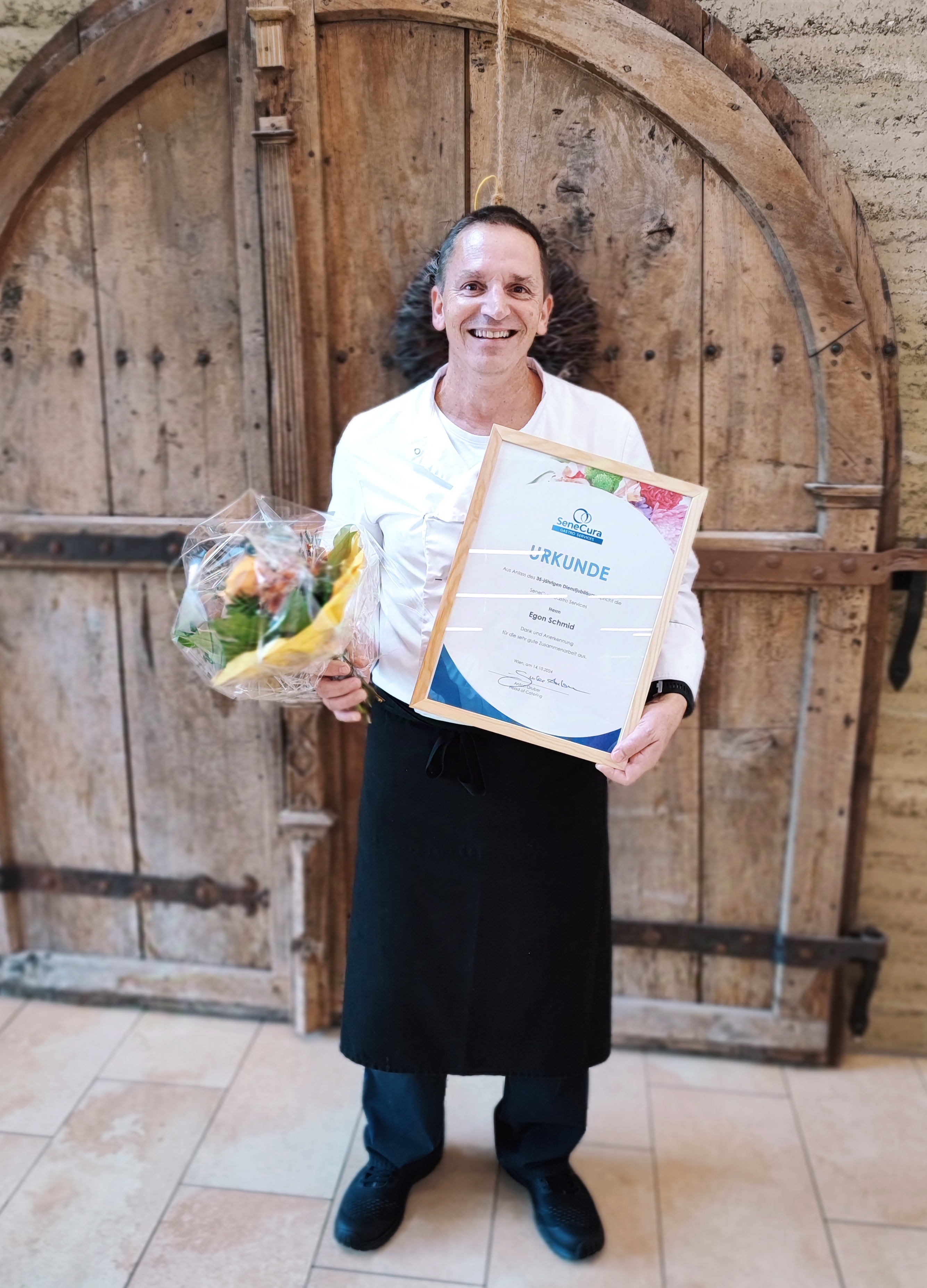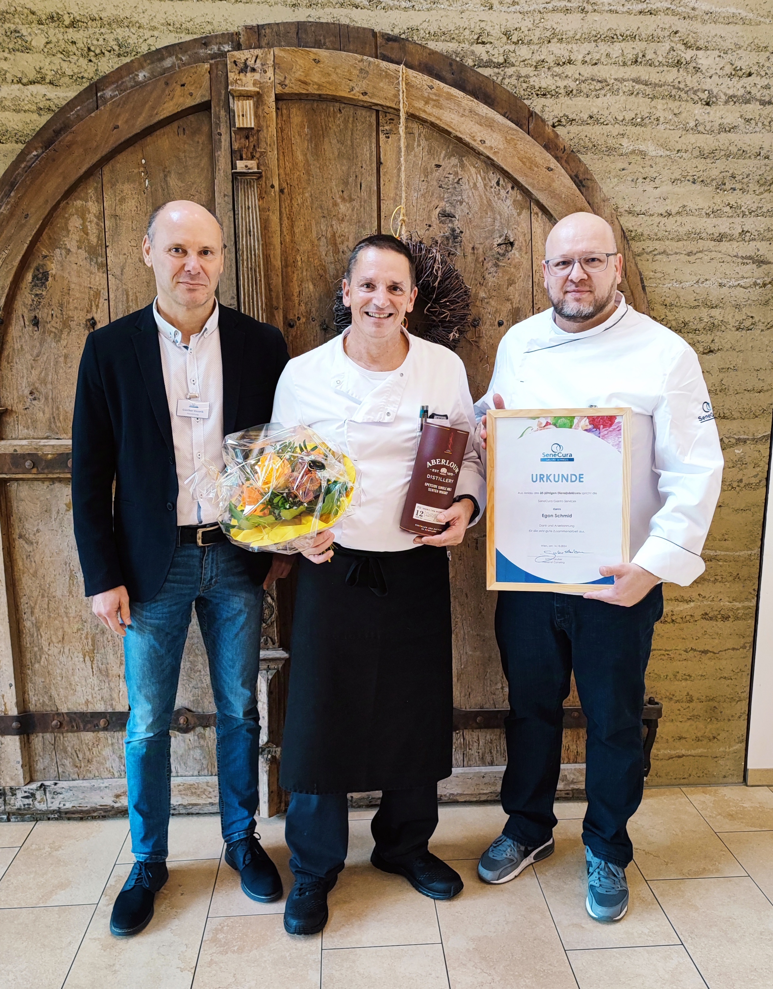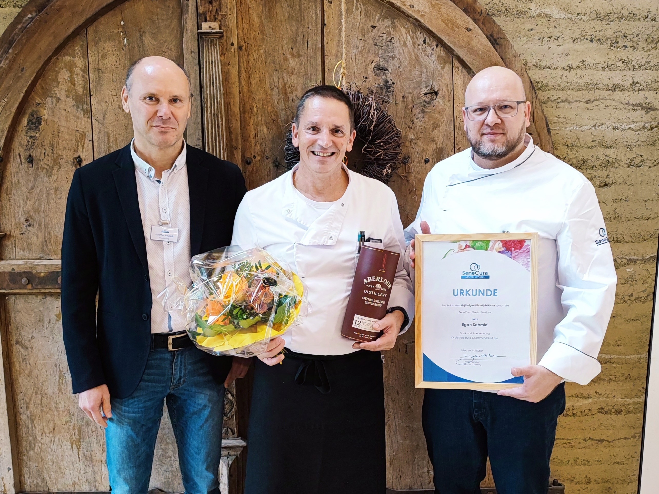 Kürzlich gab es im SeneCura Sozialzentrum Hard – Haus in der Wirke Grund zu Feiern, denn Küchenleiter Egon Schmid feierte sein 35-jähriges Dienstjubiläum. Zu diesem Anlass gratulierte ihm das ganze Team sehr herzlich und er wurde mit kleinen Geschenken von Günther Vousnik (Hausleitung) und Thomas Patzwald (Regionaler Küchenmanager Tirol & Vorarlberg) überrascht. Auch Anton Gruber (Head of Catering) bedankte sich herzlich bei Egon Schmid für seinen unermüdlichen Einsatz in Hard.
