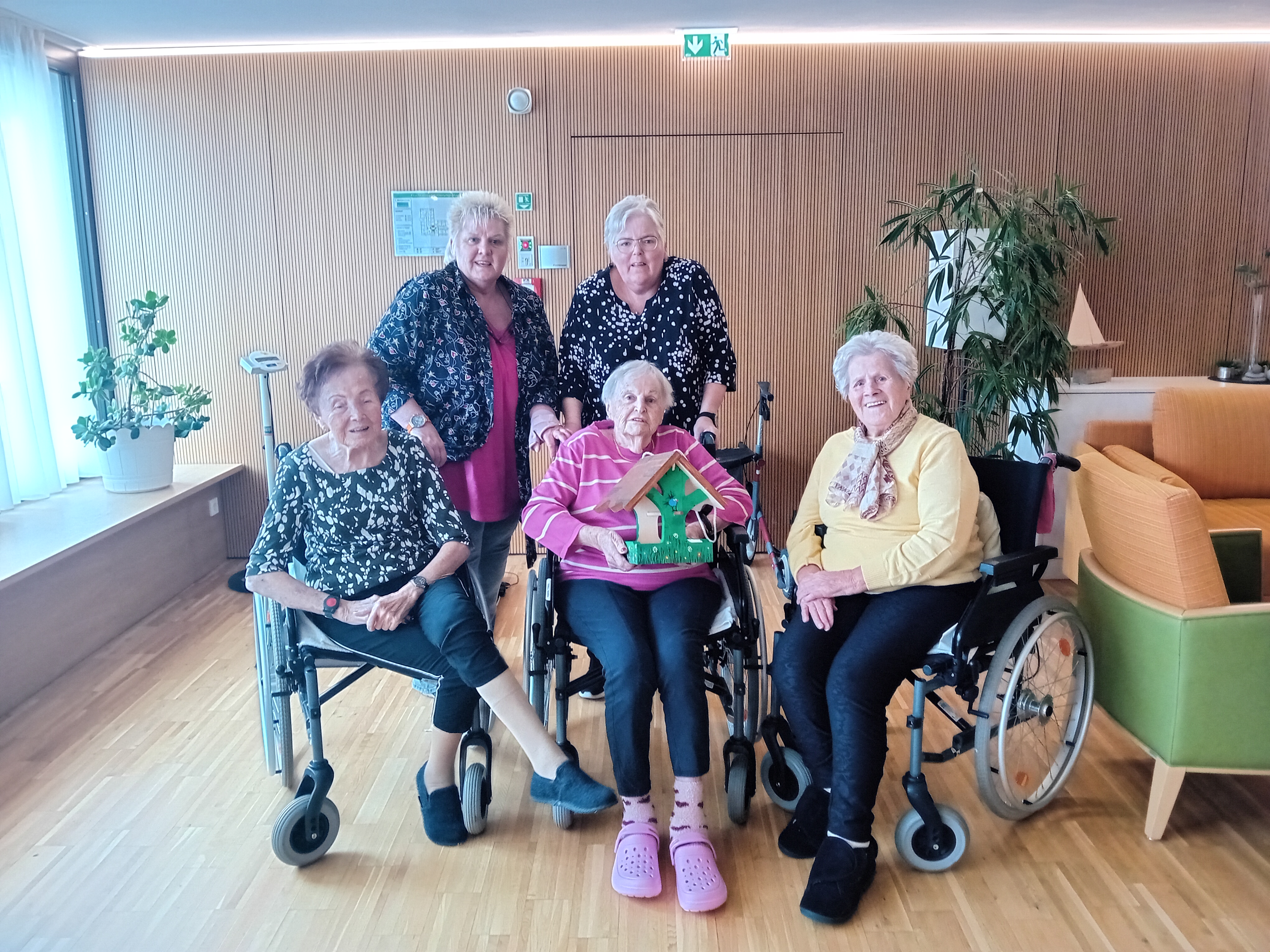 Der zweite Platz ging an das SeneCura Sozialzentrum Laurentius-Park Bludenz. Unter dem Titel „Zwitscher Stüble“ entstand ein liebevoll gestaltetes Vogelhaus, das die alpine Umgebung rund um Bludenz widerspiegelt. Beim Schleifen der Holzbauteile kamen die Bewohner Franz Malin, Günther Lindenbauer und Emil Wassle ordentlich ins Schwitzen, bevor die kreative Damenrunde mit den Bewohnerinnen Rosa Sahler, Anneliese Grafl und Maria Pichler zum Pinsel griff. Auf dem Dach sind nun die Berge zu sehen – mit etwas Glück erkennt man sogar den Muttersberg. Bäume an den Seiten symbolisieren Schutz und Geborgenheit.